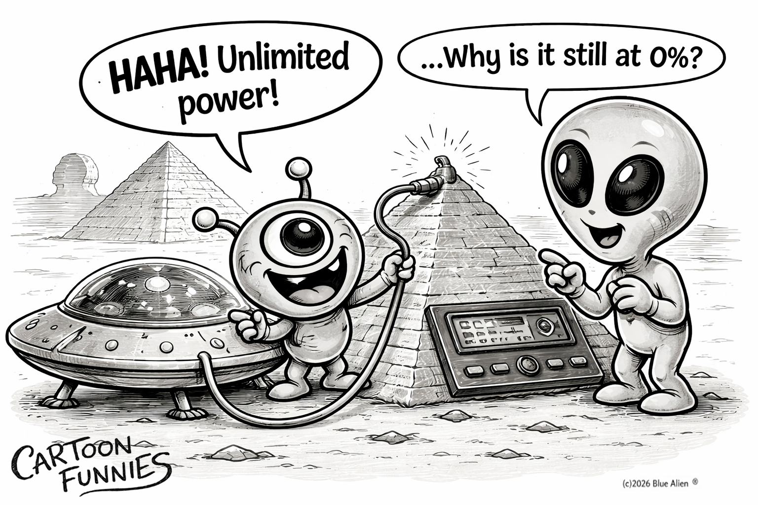 Cartoon Scene Concept – 04.15.26 Aliens and the pyramid power struggle Setting:The Great Pyramid of…